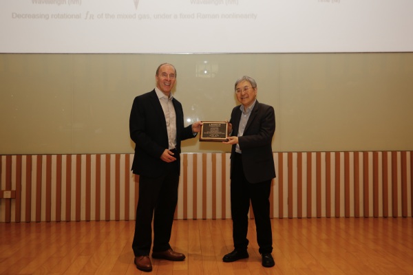在互动环节中,现场观众围绕空芯光纤中的气体非线性调控策略、新型光源在生物成像中的应用前景等问题踊跃提问,怀斯教授一一细致解答,其深邃的物理洞察与开放的学术风格赢得了阵阵掌声。报告结束后,常务副校长兼教务长印杰代表学校向怀斯教授颁发了“上科大讲坛”纪念证书。