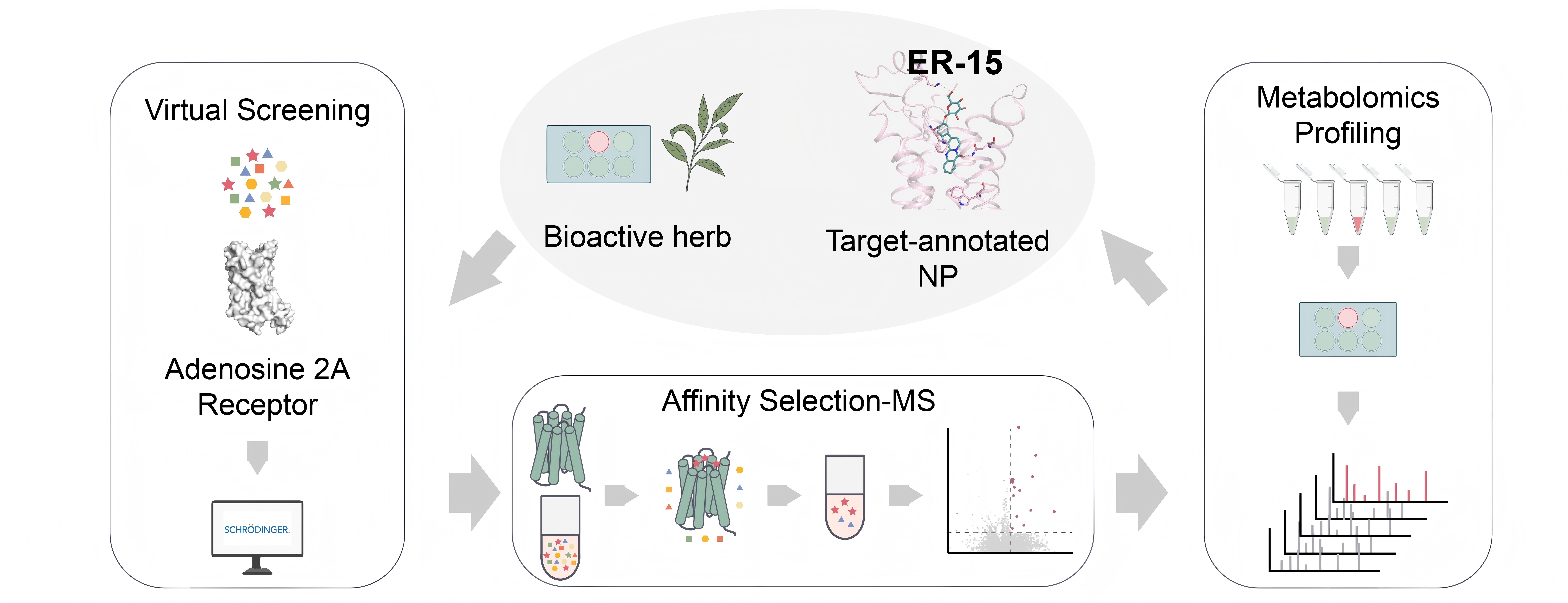 针对天然产物筛选“成分复杂、靶点不清、命中率低”等难题,研究团队建立了靶点导向的配体筛选平台(图2),综合利用三种互补方法:虚拟筛选——从天然产物数据库中预测与靶点结合的候选分子;亲和质谱——直接从复杂天然草本提取物中捕捉结合靶点的小分子配体;代谢组学——通过对不同组分化学特征与生物活性的关联性分析,进一步锁定活性小分子。通过交叉验证,团队从吴茱萸总生物碱提取物中鉴定到唯一共同命中的配体ER-15。基于质谱筛选数据定向分离,随后获得了A2AR和A2BR的双重拮抗剂ER-15。ER-15具有独特的吲哚喹唑啉生物碱糖苷结构,且对A2AR和A2BR展现优异的受体亚型选择性。进一步结合分子对接、结构预测、分子动力学模拟及功能实验,研究人员揭示了其作用机制:ER-15不仅能够与A2AR正构口袋形成稳定相互作用,其特有的糖基官能团还可与受体胞外环发生特异作用。
