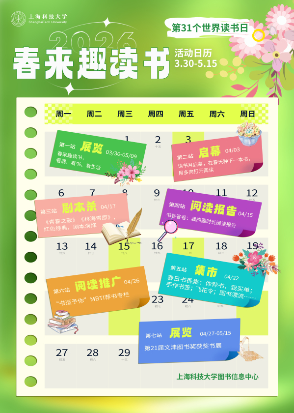 读书月期间,图信中心还将推出红色经典剧本杀、春日书香集、MBTI荐书专栏、文津图书奖获奖书展等系列活动。