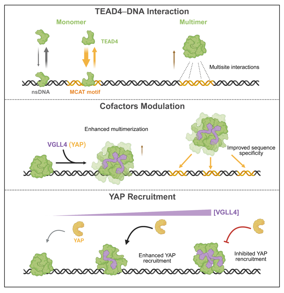 图1. 上:TEAD4 单体通过提高结合速率靶向 MCAT 基序,而其多聚化则通过建立多位点相互作用稳定 DNA 结合。中:YAP 和 VGLL4 均能促进 TEAD4 多聚体的形成,从而延长其 DNA 驻留时间并提升序列特异性。下:VGLL4 对 YAP 募集呈现双相调节效应:低 VGLL4:TEAD4 比例通过促进 TEAD4 多聚化辅助 YAP 募集;高比例则因饱和占据 TEAD4 的 YBD 结构域而抑制 YAP 募集。