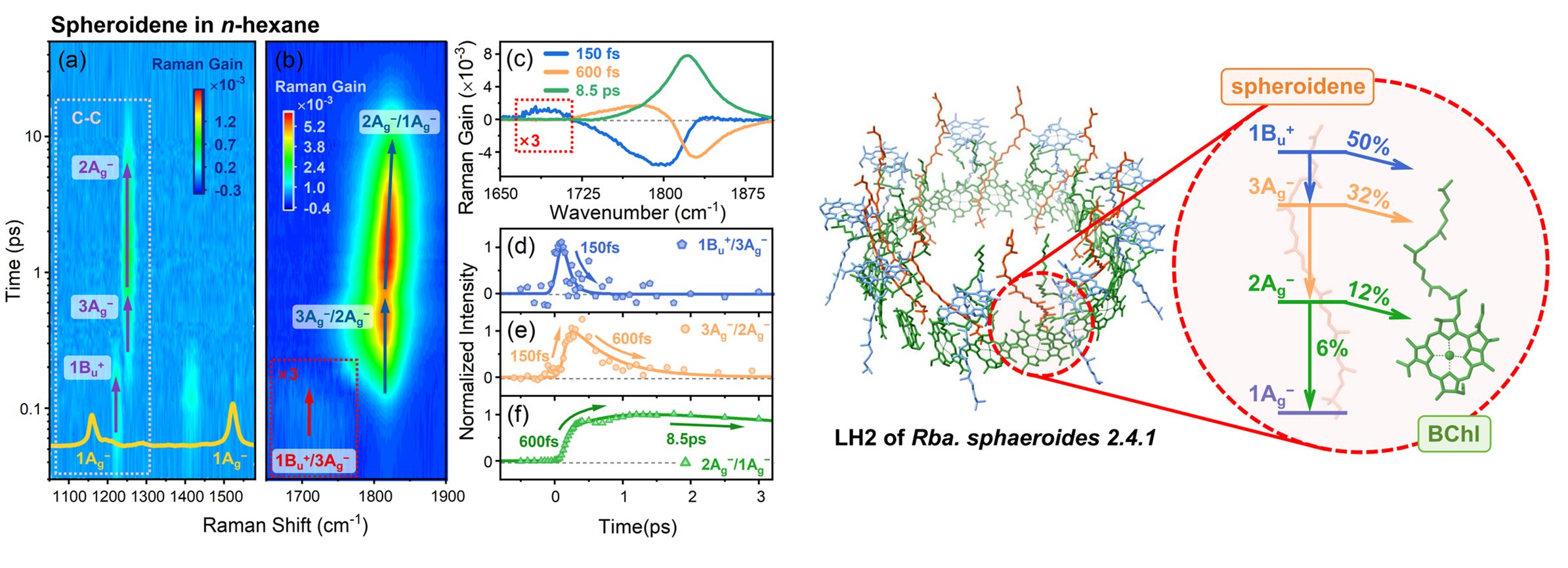 在自然界光合作用中,类胡萝卜素通过向叶绿素传递能量,显著拓展了生物体对太阳光谱的利用范围。在类球红细菌(Rhodobacter sphaeroides 2.4.1)的外周捕光天线复合物 LH2 中,共轭链长度为 10 的类胡萝卜素 —— 球形烯,能够以极高效率向细菌叶绿素 a 传递能量。阐明这一过程的微观机制,对于深入理解光合作用原初阶段的能量转化具有重要意义。