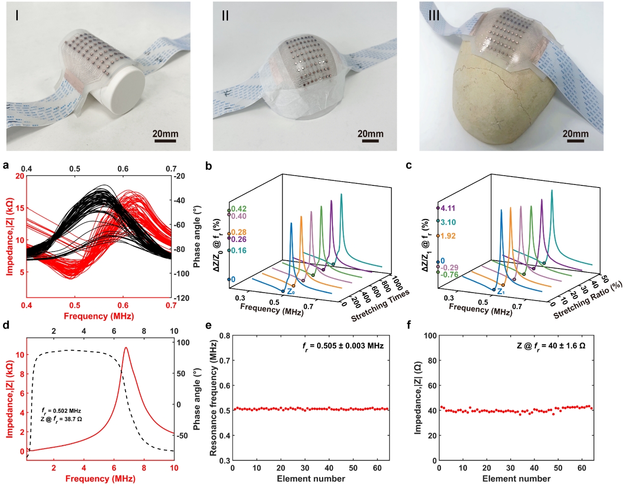 经颅聚焦超声在神经调控、血脑屏障开放和靶向给药等方面具有重要应用前景,但传统刚性设备难以贴合复杂颅骨曲面,且容易受颅骨声学异质性影响,导致聚焦偏移和能量衰减,制约了治疗精度和应用舒适性。针对这一问题,研究团队研制了8×8柔性压电阵列超声贴片,中心频率为0.5 MHz。该器件具有良好的机械柔性和电学稳定性,可贴合不同曲率的头颅表面,最大拉伸应变达60%,表现出较好的穿戴适应性。