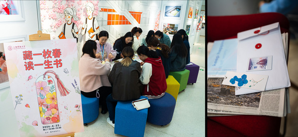 100份手工材料包在中午12点开放领取,师生们在摊位上亲手将花瓣、叶片压制成独一无二的书签,将春日的生机与阅读的静谧融为一体。不少师生表示,这样的手作体验既治愈又有仪式感,“以后每次翻开书,都能看到这个春天”。